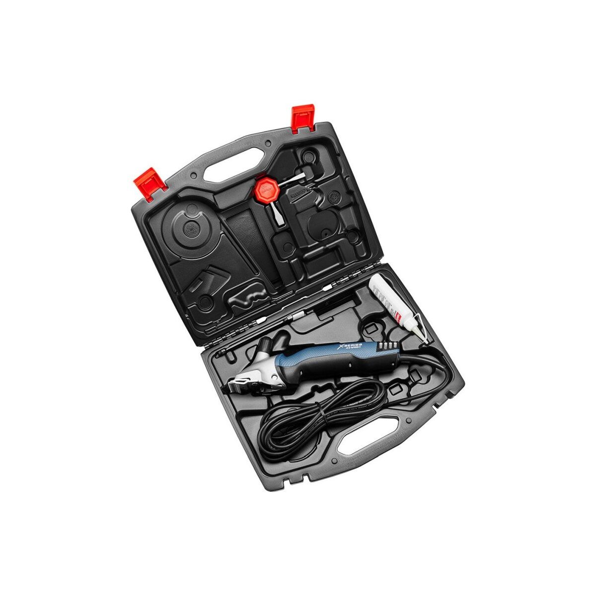 Mit bis zu 2900 kraftvollen Doppelhüben pro Minute auf der höheren Stufe und einem leistungsstarken Motor können Rinder und Pferde rasch und mühelos geschert werden.