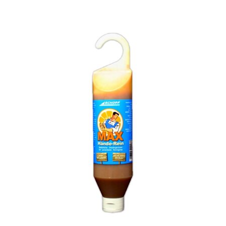Max Hände-Rein in den verschmutzten Händen kräftig verreiben. Anschließend Wasser hinzugeben und abspülen.
